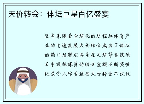 近年来,随着全球化的进程和体育产业的飞速发展,天价转会成为了体坛的热门话题。尤其是在足球等竞技项目中,顶级球员的转会金额不断突破纪录,令人咋舌。这些天价转会不仅仅是数字上的震撼,更涉及到体育市场、俱乐部战略、球员个人发展以及粉丝文化等多个层面。本篇文章将从四个方面详细阐述天价转会这一现象的多维影响,分别探讨它对体育市场的影响、俱乐部运营的变革、球员职业发展的推动,以及粉丝文化的变迁。通过这些方面的剖析,我们可以全面理解体坛巨星百亿盛宴背后的深层次原因和未来趋势。